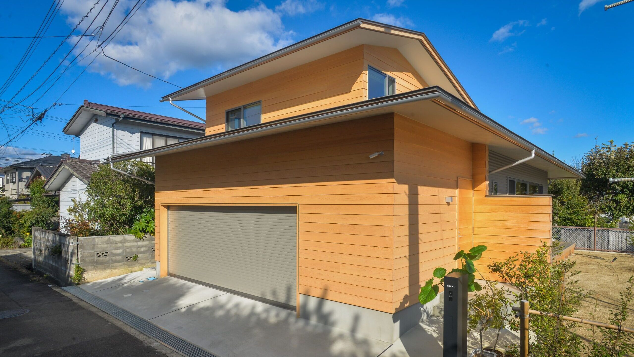 1970年代に開発された福島市内北部に位置する住宅団地内の住宅の建替えである。2.3m程の擁壁の上の計画地は、南道路越しに住宅街の屋根と遠くに山々を望む。