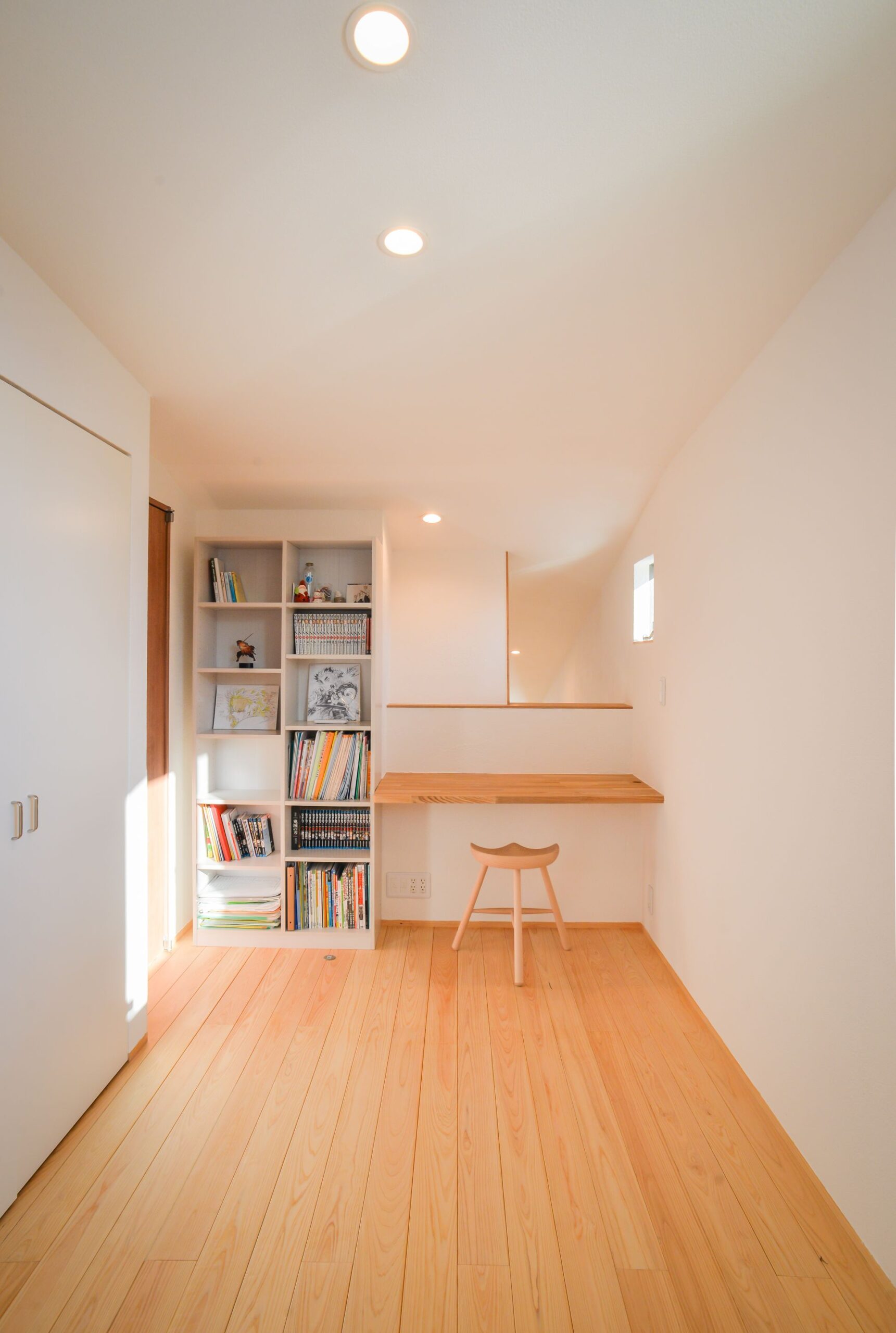 1階に階高を抑えたガレージとLDKと水廻りを配置し、ガレージ上方の2階に主寝室と子供室を配置。1階と2階をつなぐ階段の中間部にはフリースペースを計画し、直下にはロフトを配置した。フリースペースは来客時やリモートワークの際の利用を想定し、ロフトは最初は子どもや父親のこもり部屋となり、最終的には納戸となる予定である。