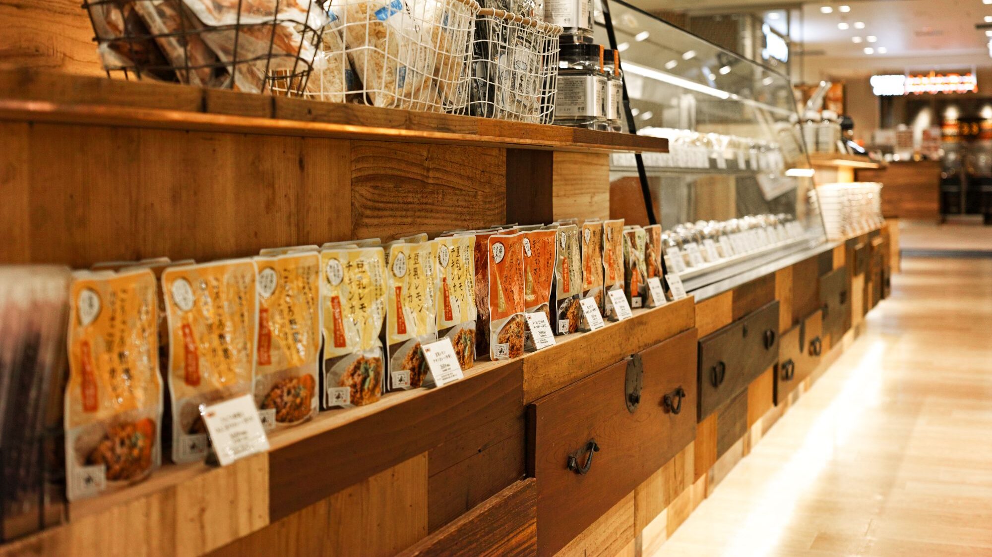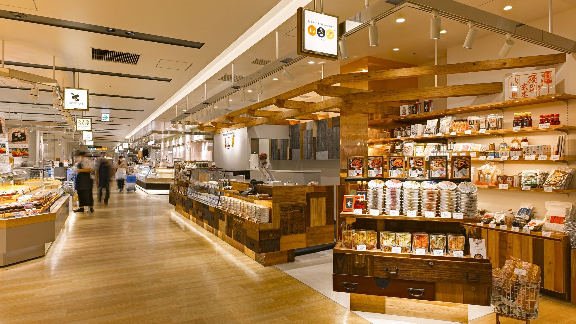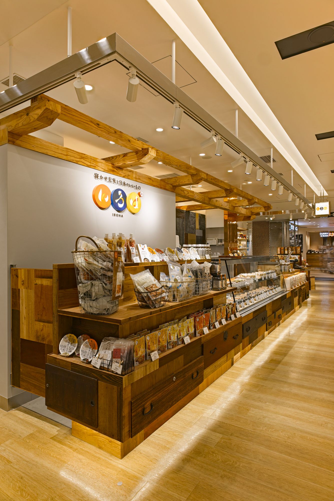 このような区画形状の場合、各コーナーが島のように離れてしまい、一店舗としての一体性、まとまりがなくなる恐れがあるため、テナント区画の領域を示すと共に、遠くからの視認性を高めるため、上部に古民家の小屋組みをイメージした木組みをぐるりと設置した。