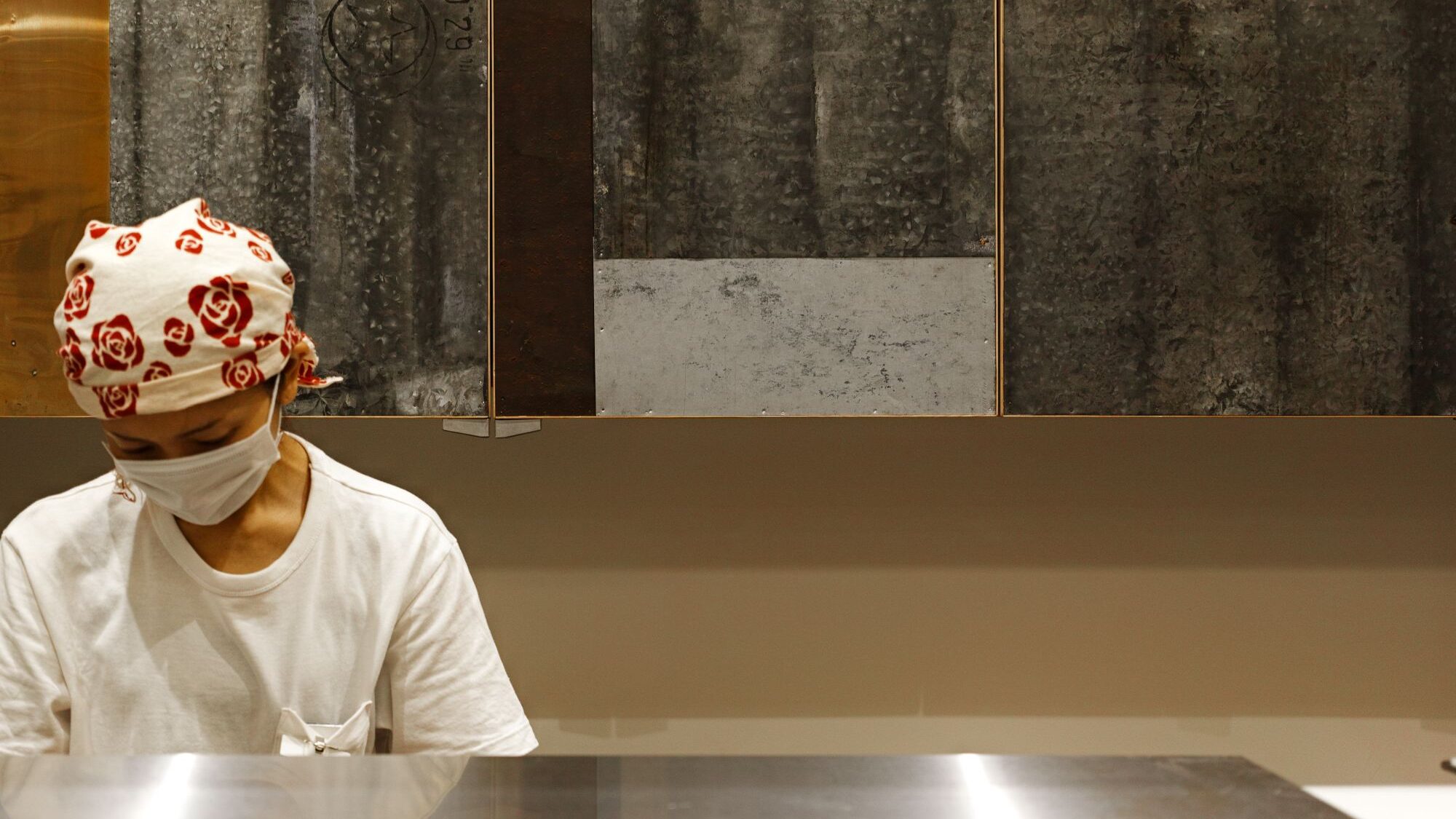 店員がおむすびを結ぶステージの背景となる吊り戸棚の扉の仕上げは、縞鋼板や真鍮板、銅板のアンティーク品のパッチワーク貼とし、什器類はいろはのアイデンティティであるアンティーク桐箪笥などのパッチワークで仕上げることで、捨てられてしまう運命だった箪笥・木材・建具などの素材に新たな役割を与えている。