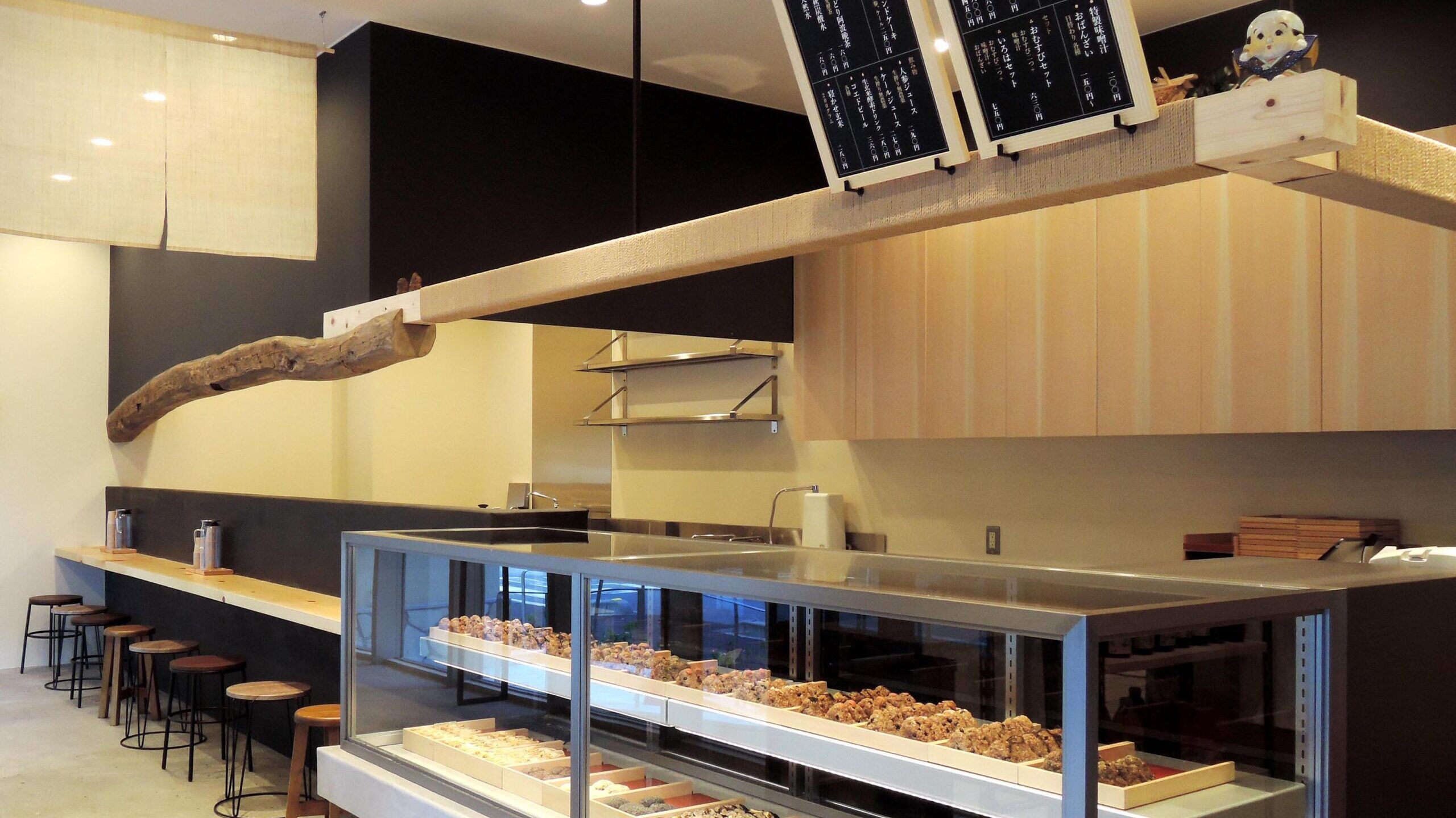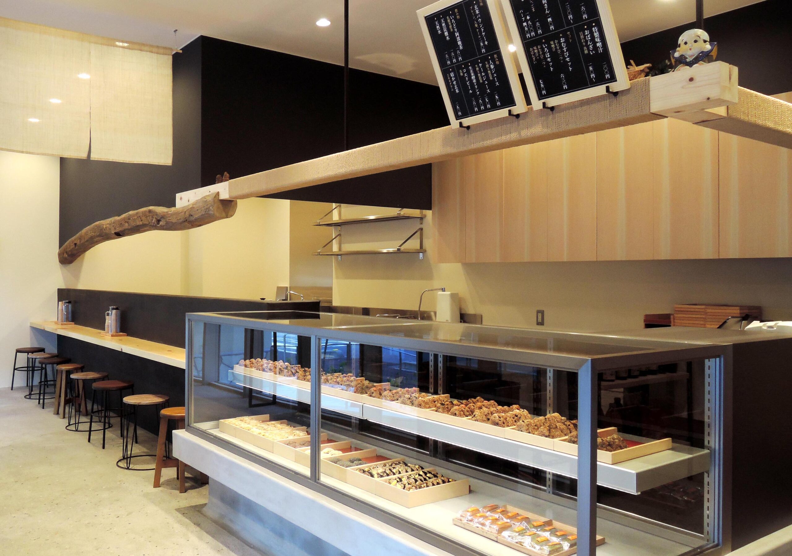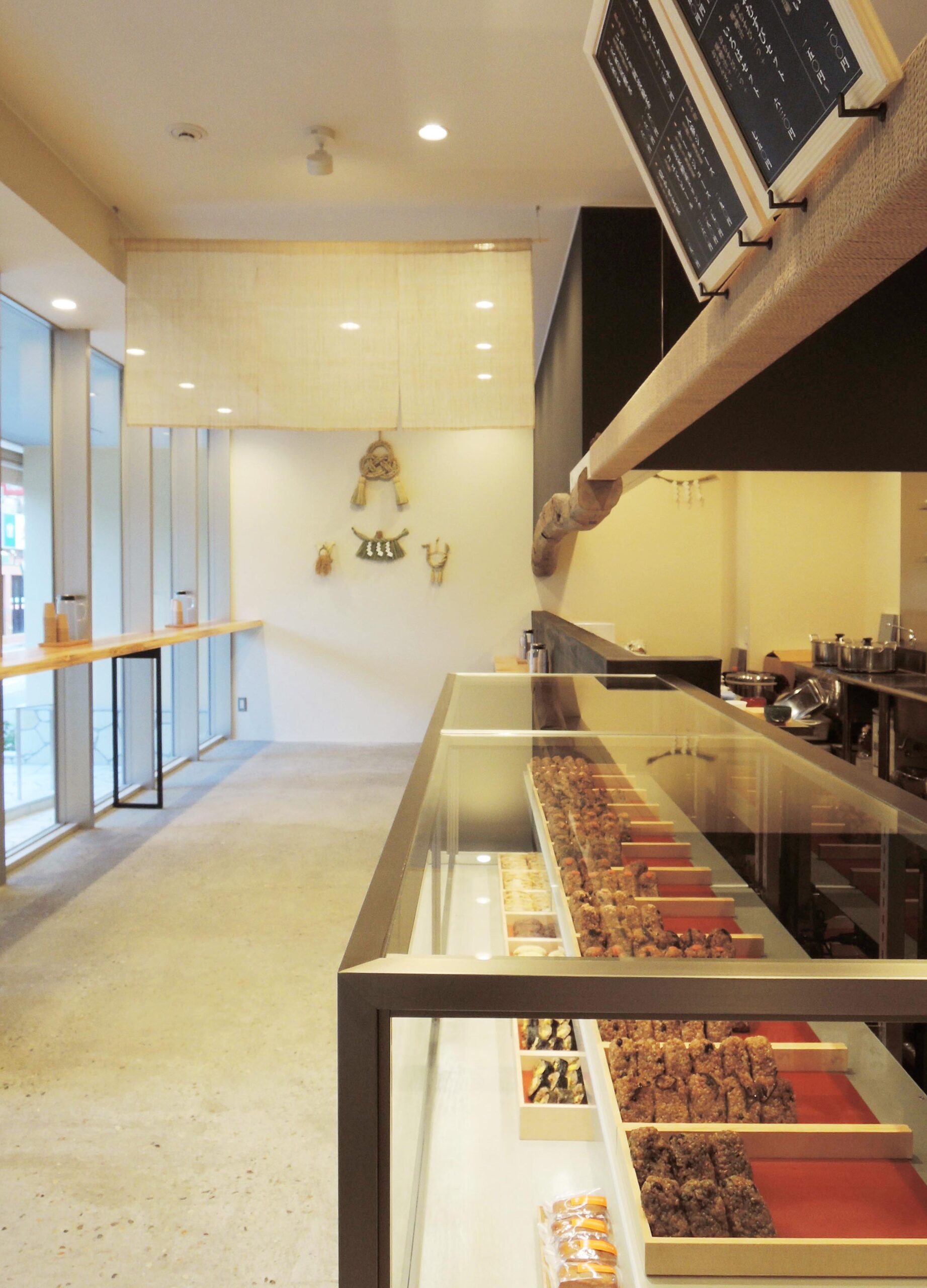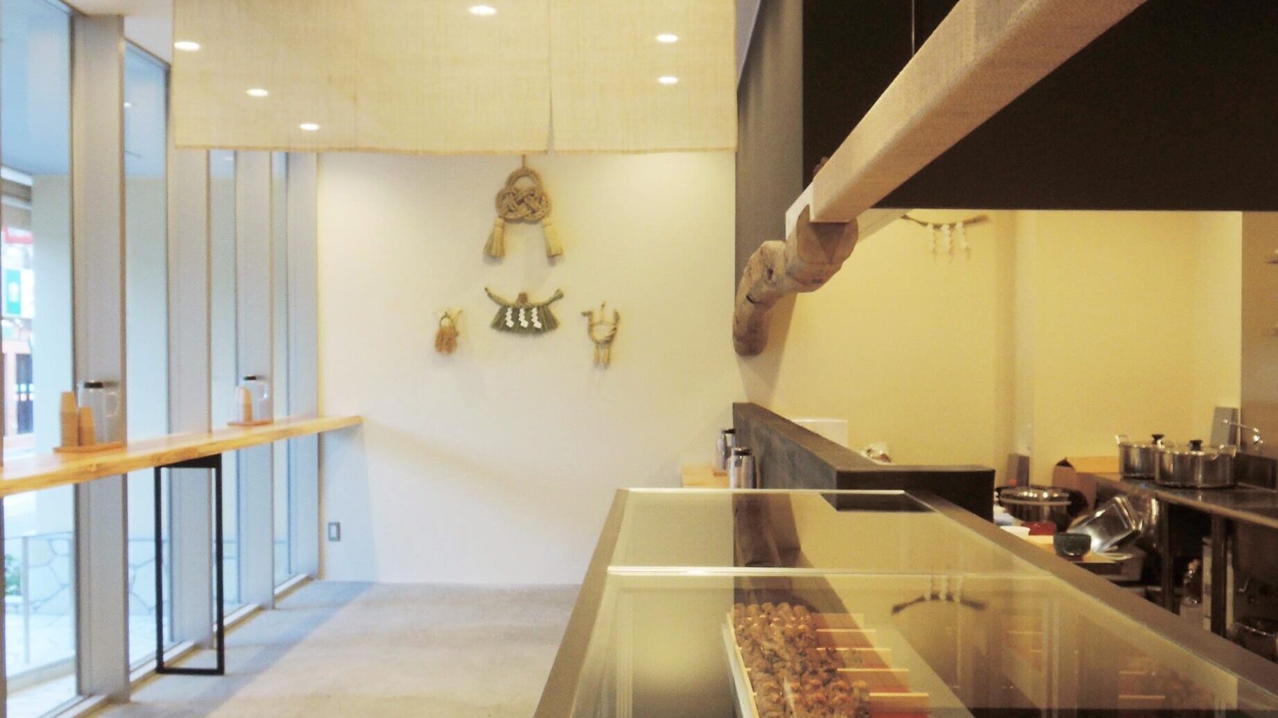 古い梁材や三和土風の床、杉の一枚板のカウンターなどの伝統的な日本の古民家をイメージさせる空間にステンレス、ガラス、スチールなどの現代の素材を差し込みました。ガラスショーケースの上方には桧の新しい角材を吊るし、運営会社の会社名(株式会社 結わえる)にちなんで、新しいものと古いものをペーパーゴードでぐるぐると結えています。